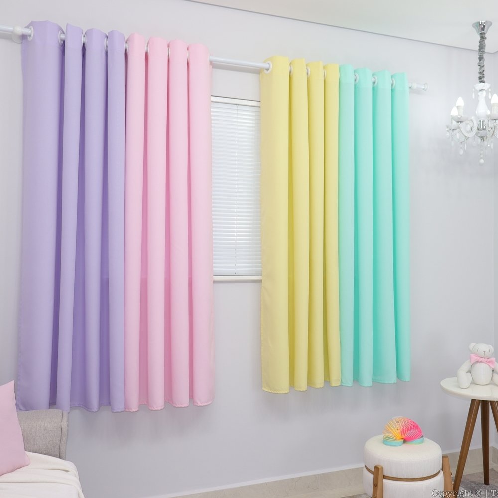 Nosso modelo Arco-íris contém a medida de 6 metros de largura de tecido esticado, pode estar usando em varão de 2 a 4 metros de largura que ficará super bonito. Essa cortina contém 4 FOLHAS AVULSAS de 1,50 cada lado uma de cada cor, com isso você pode estar utilizando várias combinações na hora de montar a cortina. A altura é de 1,80, indicado para janelas.